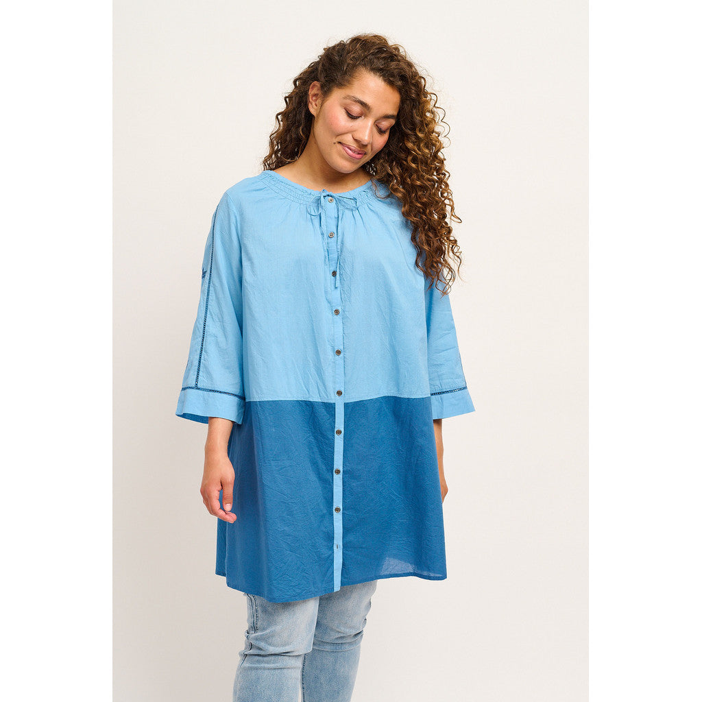 Blusen har lange halvløse ærmer og en rundt hals med elastik rundt langs kraven, som giver en slags rynkeeffekt. Skjorteblusen kommer i en super løs og afslappet pasform og har knapper hele vejen ned. Desuden kommer den i flot kombination af lyseblå og mørkeblå.