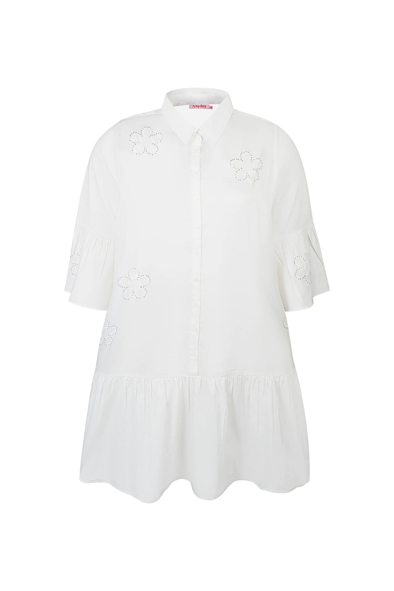 Super smuk plus size kjole fra Anyday. Kjolen har en skjortekrave, samt knappelukning et godt stykke ned ad kjolen. Derudover har kjolen halvlange ærmer, som går ud for enden. Rundt på kjolen er nogle flotte broderede blomster med sølvsten rundt om. Kjolen har også nogle folder i bunden, hvor den går lidt ud.
