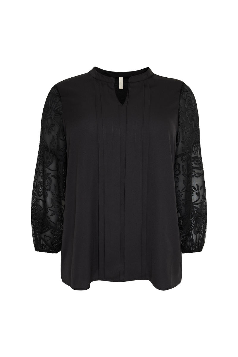 Denne smukke bluse er i fin chiffon kvalitet med de flotteste ærmer med blonder. Perfekt plus size bluse i god længde der nemt styles med et par sorte bukser eller jeans og kan bruges både til hver dag og til fest