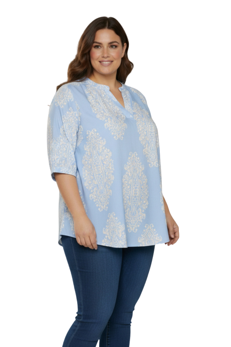 En super flot kortærmet bluse i store størrelser, der kombinerer komfort og et let, feminint udtryk. Den babyblå farve med hvidt mønster giver et friskt look, som er nemt at bruge til hverdag.