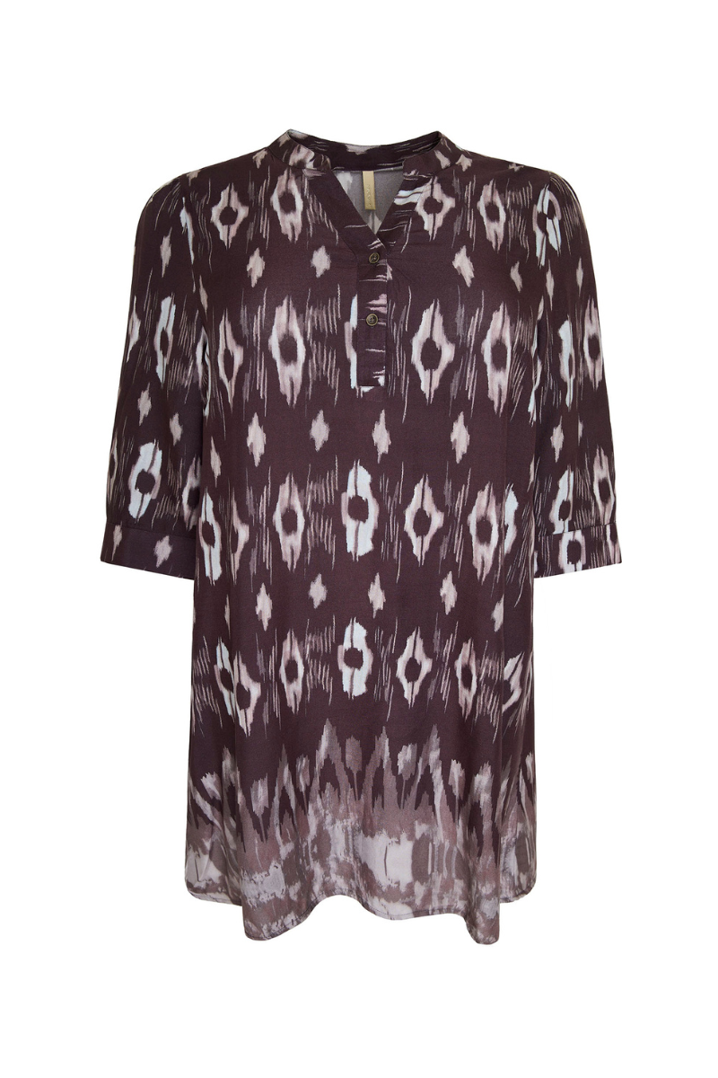 super fin tunika fra Cassiopeia i farven brun kombi. Denne super flotte tunika har en rund halsudskæring der går ned i et lille V som fortsætter ned og bliver til 2 knapper på brystet. Derudover har tunikaen halvlange løse ærmer. Tunikaen har en super løs og rummelig pasform og er med sine farver det perfekte efterårs look. Tunikaen er i skønne brunlige nuancer og med et fedt print. Den er god til hverdagsbrug såvel som til festligere lejligheder.