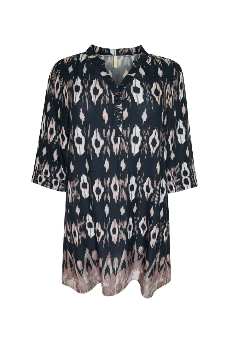 super fin tunika fra Cassiopeia i farven sand kombi. Denne super flotte tunika har en rund halsudskæring der går ned i et lille V som fortsætter ned og bliver til 2 knapper på brystet. Derudover har tunikaen halvlange løse ærmer. Tunikaen har en super løs og rummelig pasform og er med sine farver det perfekte efterårs look. Tunikaen er i skønne brunlige nuancer og med et fedt print. Den er god til hverdagsbrug såvel som til festligere lejligheder.