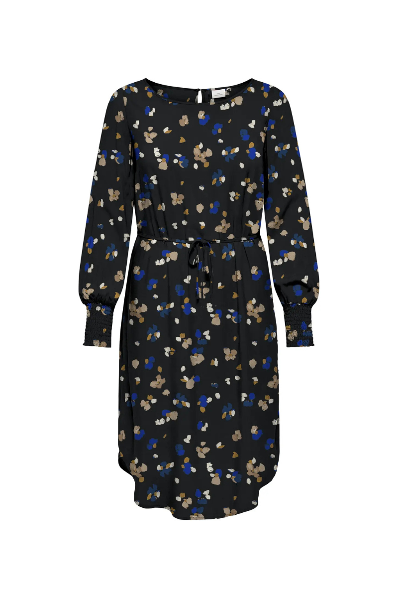 Super flot langærmet kjole i sort med flot abstrakt blomster print på i gule og blå farver.