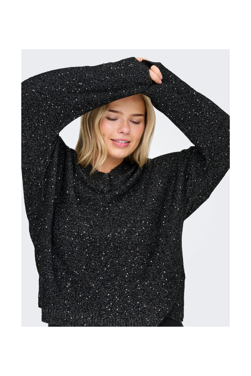 denne flotte striktrøje er i den flotteste sorte og sølv kombination. Striktrøjen har en v-halsudskæring samt lange brede ærmer. Trøjen er i et super lækkert tykt blødt stof, som gør den både varm og blød at have på, super god til vintersæsonen.
