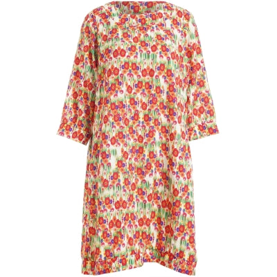 super fin plus size kjole fra Studio. kjolen er i et flot abstrakt blomster mønster i bl.a. røde, grønne lilla og gule nuancer. derudover har kjolen en rund halsudskæring samt halvlange løse ærmer og 2 lommer