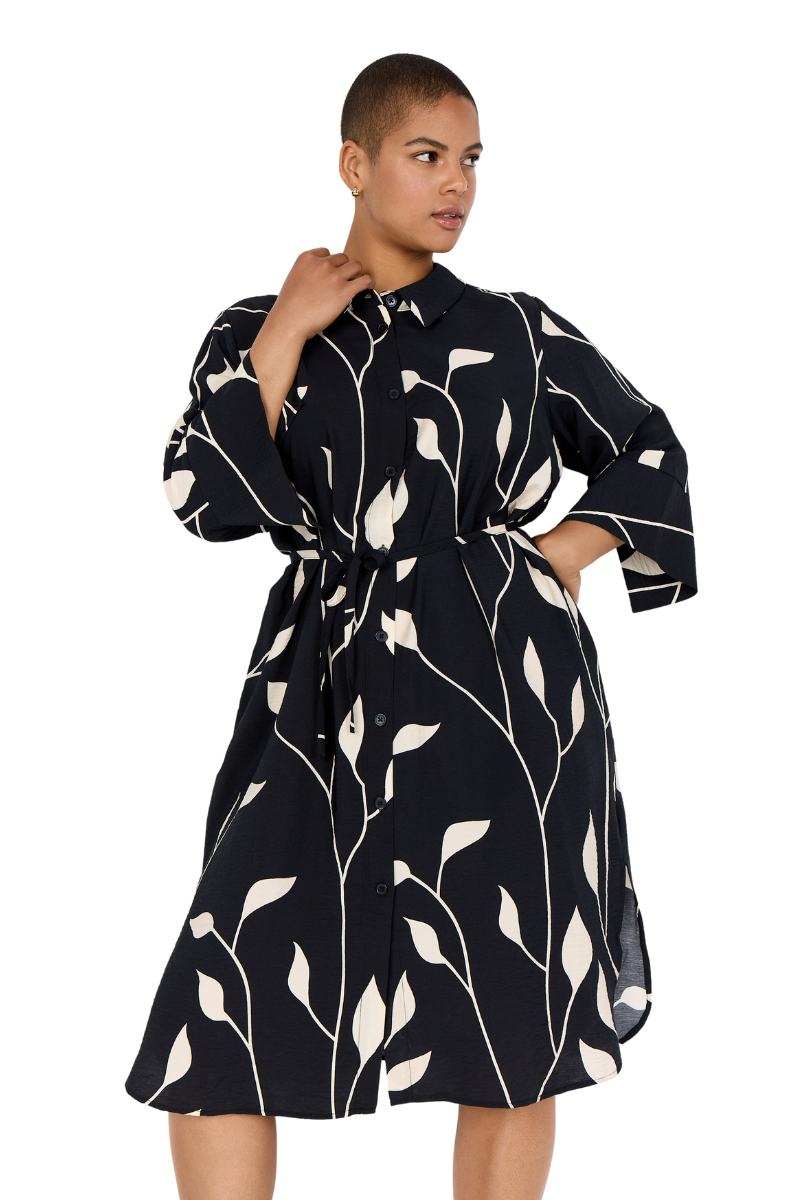 Description DA: WA-NELLY 3 Dress er fremstillet af 82% viskose, 18% polyamid. Den har en klassisk krave, knaplukning foran og et bælte i taljen. Den er skåret under knæene og prydet med et elegant bladprint. Sæt den sammen med enkle accessories og en stilfuld hæl for et sofistikeret look.