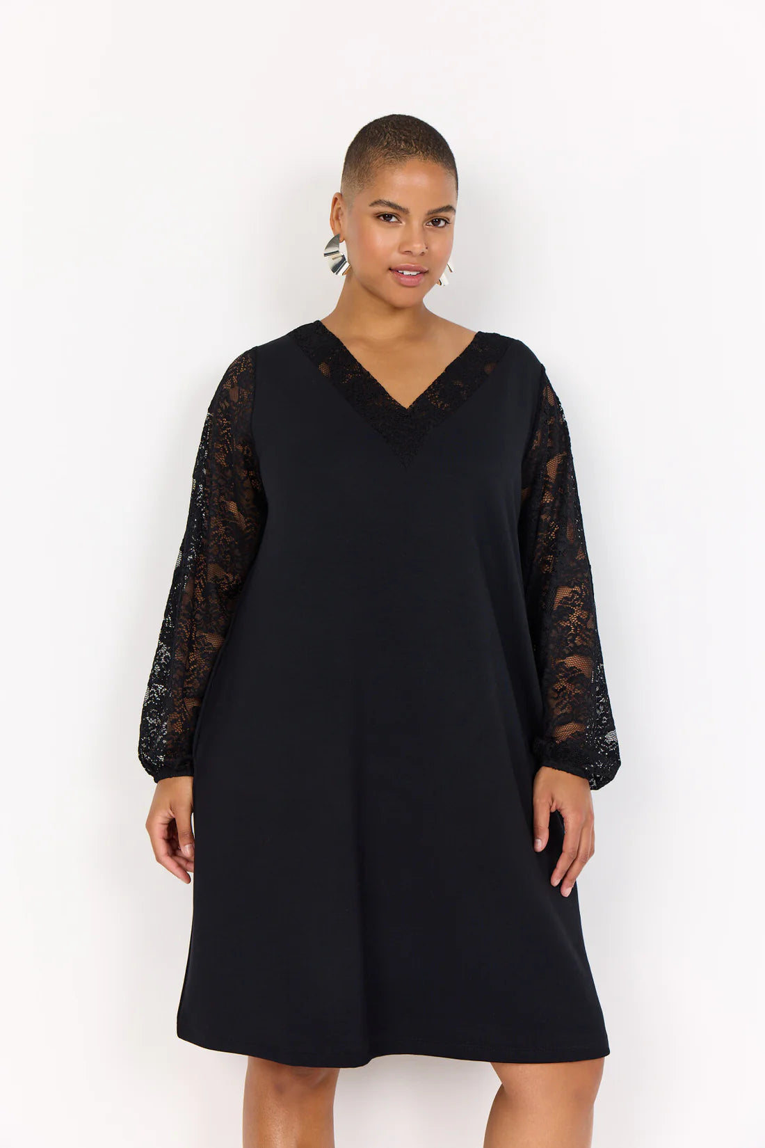 Super flot plus size kjole fra Wasabi. Kjolen er standard sort, men med lange fine gennemsigtige blonde ærmer, samt blonde ved halsudskæringen, som går ned i et V. Kjolen har gode dybe sidelommer, hvilket er en lækker praktisk detalje. Den er i et lækker blødt materiale og har en god løs pasform.