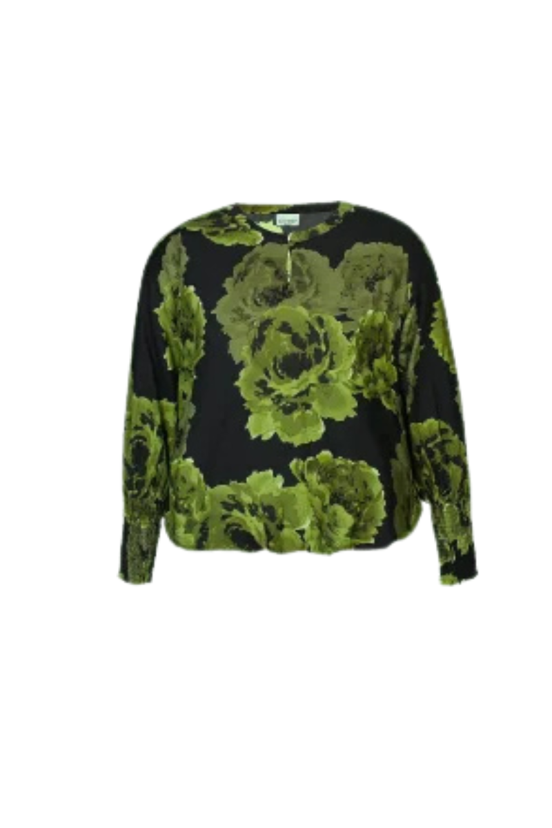Super smuk plus size bluse fra Zhenzi. Denne bluse har en flot rund halsudskæring, med et lille v under, hvortil der er en lille knappedetalje. Derudover har blusen lange løse ærmer, som har et bredt elastikbånd som afslutter ærmerne. Blusen er løs i sin pasform og falder super flot. Blusen afsluttes i bunden med elastik, hvilket gør at der skabes lidt mere facon end hvis den hænger løst. Blusen kommer i den smukkeste sorte og grønne kombi. Rundt på blusen er der store flotte grønne mønstre.