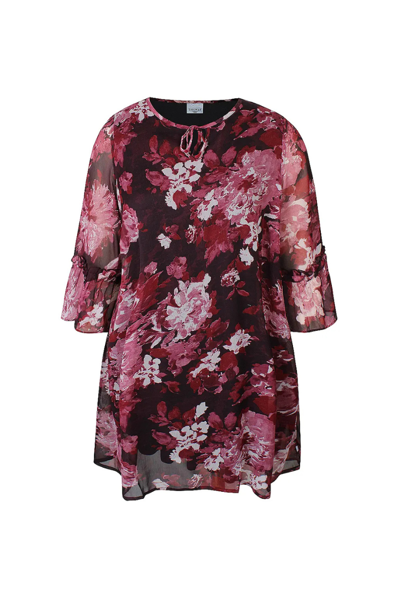 Super flot plus size kjole fra Zhenzi. Kjolen har en fin rund halsudskæring, med lille bindetalje under. Derudover har den fine 3/4 ærmer i gennemsigtigt stof med flæsedetaljer, som gør den ekstra elegant. Kjolen er i et gennemsigtigt stof, men har en underkjole så den ikke er gennemsigtig. Super flotte lyserøde og lilla nuancer kombineres i et flot blomster mønster.