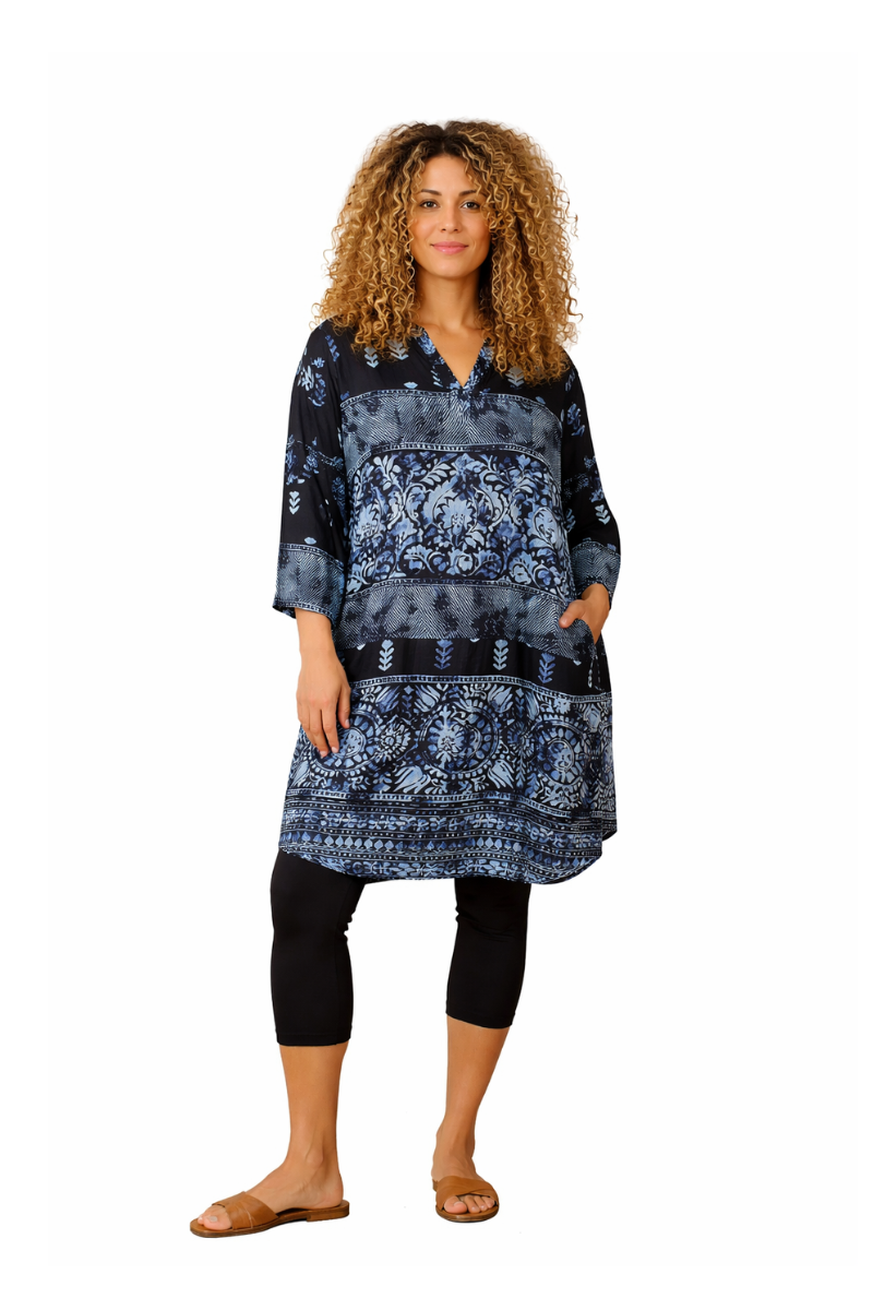 Tunikaen har en rund hals, der afsluttes med en lille v-udskæring, som giver et blødt og klædeligt udtryk. De lange, løse ærmer understreger den afslappede elegance, mens den gode længde gør den ideel til plus size-kroppe, hvor du får en behagelig og tryg pasform.