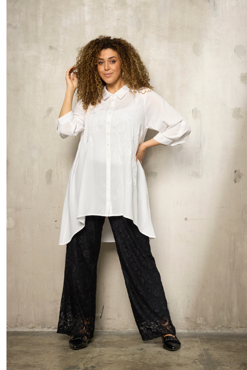 Super flot plus size tunika fra Zhenzi. Tunikaen har en almindelig skjortekrave, samt halvlange ærmer. Tunikaen har knapper hele vejen ned og kommer i hvid, med flot blomster broderi mønster på, samt små sølvperler detaljer. Tunikaen går længere ned bagpå end foran.